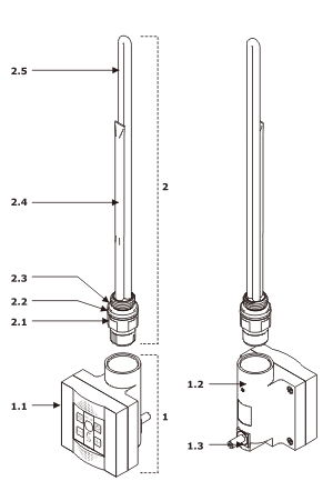 Wählen Sie die Option, in der die Heizpatrone im Heizkörper installiert werden soll. Einlegen der Kunststoff-Abdeckung. Installieren Sie die Heizpatrone. Terma Heizpatrone SIM, Farbe: inox.